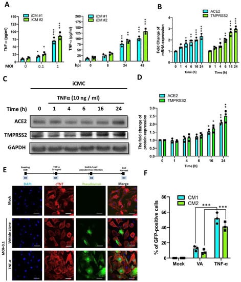 Based upon our bioinformatics analysis, several inflammation-related genes were upregulated following the viral infection, including the CXCL10, TNF-α, and interleukin 1α, etc. Since the elevated expression of TNF-α has been reported during the initial stages of SARS-CoV-2 infection and may serve as a key component of the cytokine storm in COVID-19 [,], we hypothesized that TNF-α may contribute to the aggravation of the COVID-19 manifestations. Based upon our data of TNF-α as an upregulating factor in SARS-CoV2-infected iCMs, we next examined the consequence of SARS-CoV2 infection on TNF-α secretion. We exposed iCMs to various MOI of SARS-CoV2 or SARS-CoV2 (MOI = 1) for a different time and then examined the secretion of TNF-α in the culture of iCMs (Figure 5A). Our data revealed that SARS-CoV2 promoted TNF-α secretion in both MOI- and time-dependent manners. Next, we examined the effect of TNF-α treatment on the expression of ACE2 and TMPRSS2 in iCMs using qRT-PCR (Figure 5B). The exposure of iCMs to TNF-α (10 ng/mL) for different time periods resulted in a time-dependent increase in ACE2 and TMPRSS2 expression (Figure 5B). In addition, the Western blot data further confirmed the upregulation of ACE2 and TMPRSS2 proteins after the TNF-α treatment (Figure 5C,D). SARS-CoV2 pseudovirus is an artificial virus that carries the S protein of SARS-CoV2 and mimics the SARS-CoV2 entry process in target cells []. To examine whether the increase of ACE2 and TMPRSS2 protein contribute to the exacerbation of inflammatory response, we then investigated the viral entry of SARS-CoV2 pseudovirus in iCMs. The SARS-CoV2 pseudovirus was generated by transfecting the 293T cells with a lentiviral backbone plasmid encoding a fluorescent reporter protein and the spike (S) protein. Therefore, the entry of SARS-CoV-2 pseudovirus into the host cells could be tracked by detecting GFP signal. One day after the seeding, iCMs were treated with TNF-α (10 ng/mL) for the additional period of 24 h. After the TNF-α treatment, these iCMs were subjected to SARS-CoV2 pseudoviral infection for 24 h, followed by harvesting of iCMs and immunofluorescence staining (Figure 5E, upper). As demonstrated by the incorporation of the fluorescent signal, TNF-α treatment significantly increased the entry of SARS-CoV-2 pseudovirus into the host cells, as compared with iCMs treated with vehicle alone (Figure 5E,F). Collectively, these data indicated that TNF-α upregulates SARS-CoV2 entry receptors and exacerbates SARS-CoV2 pseudoviral infection in iCMs.