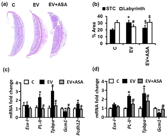 Since procoagulant EVs can activate platelets in vivo [8,9,10], we next evaluated whether the altered histology and trophoblast differentiation, seen upon EV injections, depends on platelet activation. Platelet inhibition using aspirin treatment prevented the histological changes and altered expression of trophoblast differentiation marker genes and of glycogen-rich cells observed upon EV administration (Figure 2a–c). Similar to the in vivo situation, platelets from aspirin-injected mice did not impair the trophoblast differentiation marker gene expression in vitro in EV-exposed differentiating murine trophoblast stem cells (Figure 2d). Taken together, these results suggest that the effects of EVs on trophoblast differentiation and glycogen-rich cells depend on platelet activation.