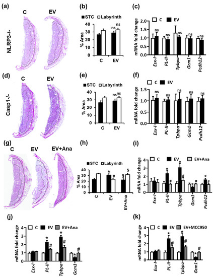 EV-induced platelet activation triggers ATP-mediated purinergic receptor signaling and NLRP3 inflammasome activation within the placenta [8]. Therefore, we studied whether pharmacological or genetic inflammasome inhibition can prevent the effects of EVs on placental development. EV administration failed to alter the thickness and morphology of STCs or labyrinth in NLRP3−/− as well as in Casp-1−/− mice in comparison to WT (C57BL/6) mice (Figure 3a–f). Furthermore, we did not observe any significant difference in the trophoblast differentiation marker genes in these mice upon EV injections (Figure 3c,f). Similarly, treatment of EV-injected WT pregnant female mice with IL-1R antagonist anakinra restored the morphological alterations, impaired trophoblast differentiation, and GRCs (Figure 3g–i). Anakinra treatment or NLRP3 inhibition using MCC950 in EV-treated mTS cells likewise prevented EV-induced altered trophoblast differentiation (Figure 3j,k). These findings indicate that EV-induced platelet-mediated inflammasome activation in the murine placenta and trophoblast cells impair trophoblast differentiation and GRCs within the placenta.