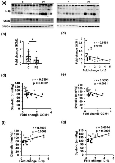 Trophoblast differentiation is associated with inflammasome activation in human PE placenta. (a–c) Trophoblast differentiation marker GCM1 (a), representative immunoblots; (c,d), quantification summarizing results) is reduced (c) in human placenta from preeclampsia (PE) and inversely correlated with inflammasome marker cleaved IL-1β (b) in control (C, black dots) and PE (grey dots) patients. (d–g) Diastolic and systolic blood pressure are negatively correlated with trophoblast differentiation marker GCM1 and positively correlated with inflammasome marker (IL-1β) in control and preeclampsia patients. n = 14 placenta each group; * p < 0.05 (correlation: t-test, (c–g): Spearman’s correlation).