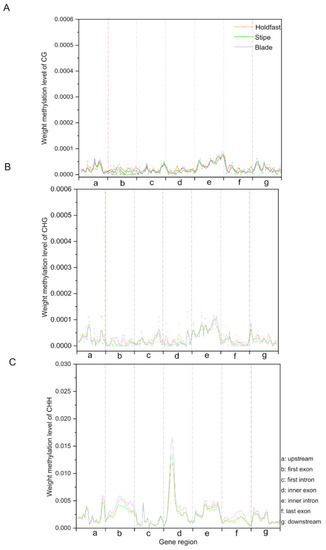 The DNA of the holdfast, stipe and blade were extracted using the Super Plant Genomic DNA Kit (Polysacchardes & Polyphenolics-rich) (Tiangen, Beijing, China) according to the manufacturer’s recommendations. Following the evaluation of the DNA purity and integrity, 1 µg of qualified genomic DNA was sonicated into sizes between 200–400 bp. The fragmented DNAs were subjected to end-repairing and adenylation. DNA fragments were then treated with bisulfite to convert the unmethylated cytosine into uracil. All the converted fragments were amplified by PCR to construct the final methyl C-seq libraries and then sequenced by an Illumina HiSeq4000 PE101 (Illumina, San Diego, CA, USA) platform.