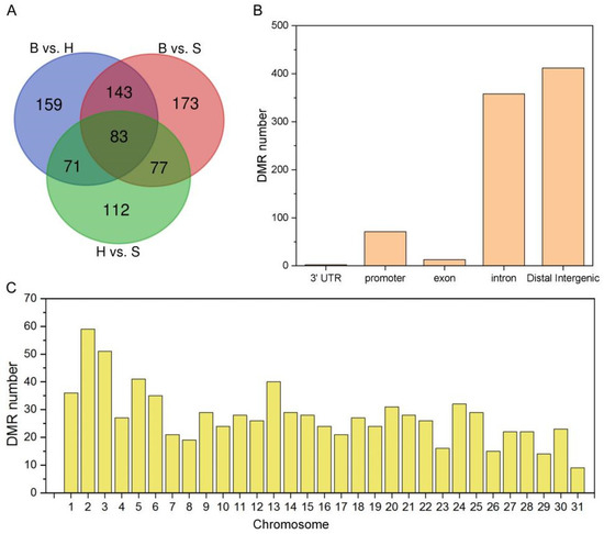 Genomic distribution of DMRs among the holdfast, stipe and blade of sporophytes. (A) Venn diagram of DMR numbers identified in “B vs. H”, “B vs. S” and “H vs. S” groups. B, H, and S are the samples of blade, holdfast, and stipe, respectively. (B) The distribution of DMRs in different genomic regions, including 3′UTR, promoter, exon, intron and distal intergenic. (C) The detailed distribution of DMR numbers in the 31 chromosomes of sporophytes.
