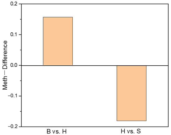 The methylation level of mannuronate C5-epimerase (MC5E) genes (Gene ID: EVM0008148) in the “B vs. H” and “H vs. S” groups. The positive value of methylation level represents the hypermethylation condition, and the negative value of methylation level represents the hypomethylation condition. B, H and S are the samples of blade, holdfast and stipe, respectively.