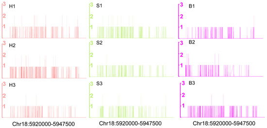 The following are available online at https://www.mdpi.com/article/10.3390/ijms22189877/s1, Correlation Analysis between DNA Methylation and Gene Expression in Promoter Region. In total, we identified 60 promoter-associated DMR related genes, and randomly selected 26 genes for further transcript analysis. All genes exhibited obvious differential expression in “B vs. H” and “B vs. S” groups (Figure S7). However, negative correlations between the transcriptional abundances and DNA methylation levels were not obvious (Figure S8).