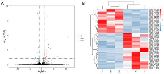 Effects of 5-AzaC treatment on the transcriptome of sporophytes. (A) The volcano plot of different expression genes (DEGs) present, in which blue dots indicate down-regulated genes and red dots indicate up-regulated genes in response to 5-AzaC treatment. (B) Cluster analysis of differential expression genes. Each row represents one DEG, and the color gradually changes from blue to red, indicating the shift of gene expression level from low to high. CK represents the control group, and T represents the 5-AzaC treatment group.