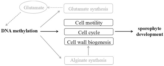 Systematic analysis revealed that there were three characteristics of 5-mC modification in sporophytes: (1) the low 5-mC degrees, (2) the dominance of the CHH context and (3) the preference of exons within gene regions. 5 mC methylation participated in the cell development by regulating the algiante synthesis and gluatmate metabolism (Figure 9), mediating the holdfast, stipe and blade development of S. japonica. Overall, our studies enhance our knowledge of epigenetic mechanisms during the growth and development of S. japonica.