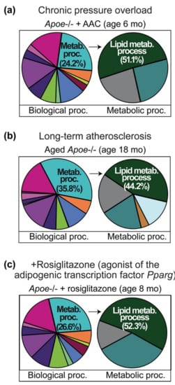 Among several groups of differentially expressed and heart-failure-related gene groups, GO analysis identified the prominently up-regulated cardiac “lipid metabolic process” in three different heart failure models (Figure 1a–c, and Tables S1–S3). In the GO category “primary metabolic processes”, the up-regulated cardiac “lipid metabolic process” was the predominant GO term of all three experimental heart failure models (Figure 1a–c). In this category of “primary metabolic processes”, the “lipid metabolic process” encompassed 51.1% of up-regulated probe sets of 6-month-old Apoe-/- mice with AAC-induced heart failure (Figure 1a). The “lipid metabolic process” comprised 44.2% of up-regulated probe sets of 18-month-old Apoe-/- mice with advanced atherosclerosis-induced heart failure (Figure 1b) and 52.3% of up-regulated probe sets of Apoe-/- mice with rosiglitazone-induced heart failure (Figure 1c).
