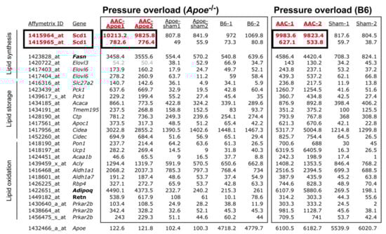 DNA microarray probe set intensities of heart-failure-related and concordantly up-regulated genes of the cardiac lipid metabolic process of different heart failure models are listed in Figure 3 and Figure A1. Genes of the cardiac lipid metabolic process were similarly up-regulated in three different heart failure models of hypercholesterolemic Apoe-/- mice and in failing hearts of non-transgenic B6 mice (Figure 3 and Figure A1). Notably, probe set intensities of up-regulated transcripts of the cardiac lipid metabolic process were comparable between non-transgenic C57BL/6J (B6) mice with heart failure induced by AAC and hypercholesterolemic Apoe-/- mice subjected to AAC (Figure 3).