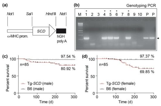 Generation of Tg-SCD mice with myocardium-specific expression of SCD. (a) Scheme of plasmid used for generation of Tg-SCD mice; (b) identification of mice with stable genomic insertion of the SCD transgene by genotyping PCR. SCD-transgenic mice are marked with a star (*), (P: plasmid control); (c) survival rate of male Tg-SCD mice compared to male, non-transgenic B6 mice; (d) survival analysis of female Tg-SCD mice compared to female, non-transgenic B6 mice (n = 85 mice per group).