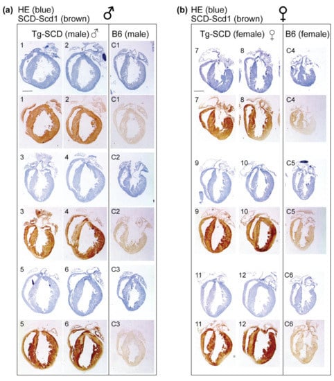 Immunohistological analysis shows cardiac enlargement of Tg-SCD mice and increased cardiac SCD protein levels. (a,b) Hematoxylin-eosin-stained heart sections (HE blue) and immunohistological staining with knockout-validated SCD-specific antibodies (SCD-Scd1 brown) of increased myocardial SCD protein levels on cardiac specimens of eight-month-old male (a) and female (b) Tg-SCD mice compared to those of non-transgenic B6 controls (bar: 2 mm; n = 6 male (1–6) and n = 6 female (7–12) Tg-SCD mice; n = 3 male (C1–C3) and n = 3 female (C4–C6) B6 control mice). Quantitative data are shown in Figure A2 in Appendix A.