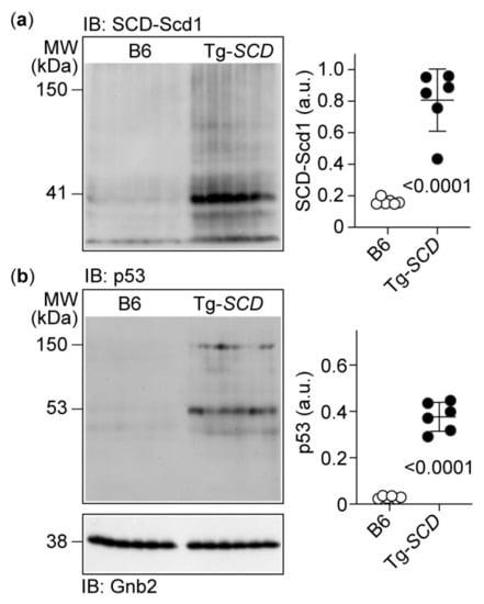 2.6. Immunoblot Analysis Shows Increased Cardiac SCD and Pro-Apoptotic p53 Protein Levels of Tg-SCD Mice