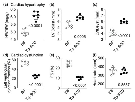 Assessment of heart-weight to body-weight ratio confirmed the phenotype of cardiac hypertrophy of Tg-SCD mice (Figure 7a). As control, body-weights of Tg-SCD mice were not significantly different from those of non-transgenic B6 controls (Figure A3). In agreement with cardiac enlargement, echocardiographic examination showed an increased left ventricular inner diameter at end-diastole (LVIDdiast) and end-systole (LVIDsyst) of Tg-SCD mice (Figure 7b,c).