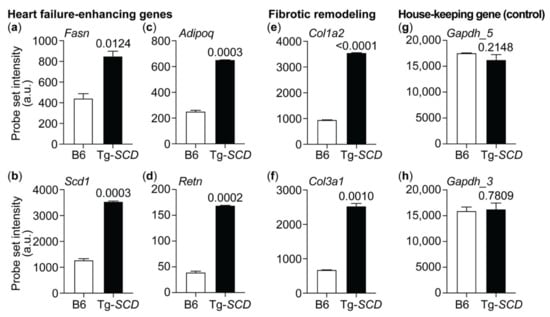 Gene expression analysis detected up-regulated heart-failure-related genes of the lipid metabolic process (Figure 8a–d). The probe set intensity of the major palmitate-synthesizing and heart-failure-promoting Fasn was significantly higher in Tg-SCD hearts in comparison to that in non-transgenic B6 hearts (Figure 8a). In addition to Fasn, Tg-SCD hearts showed up-regulation of the murine Scd1 transcript (Figure 8b). This finding is noteworthy because the GeneChip Mouse Genome MG430 2.0 array (Affymetrix) does not detect the human SCD transgene. Thus, SCD-induced symptoms of heart failure are accompanied by up-regulation of the murine Scd1 transcript as another heart-failure-related gene of the lipid metabolic process. In agreement with heart failure symptoms, Tg-SCD hearts displayed increased expression of heart-failure-related markers, Adipoq and Retn (Figure 8c,d).
