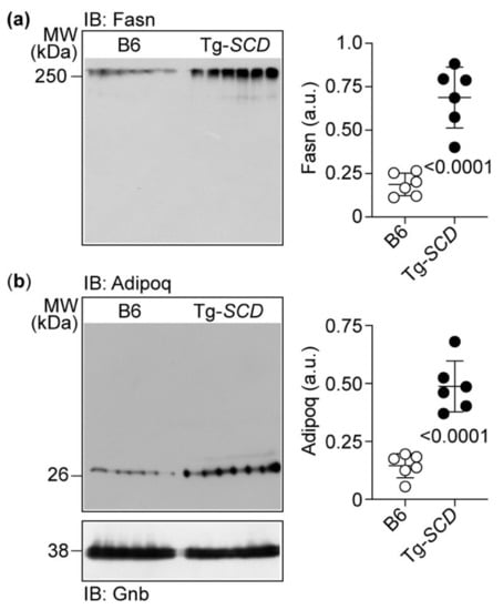 Immunoblot detection also confirmed increased Adipoq levels of Tg-SCD hearts (Figure 9b). Adipoq levels of Tg-SCD hearts were 3.4 ± 0.8-fold higher than those of B6 hearts (Figure 9b). Together, these data show that Tg-SCD mice develop heart failure with cardiac hypertrophy and cardiac dysfunction at an age of 8 months with concomitantly increased cardiac protein levels of heart-failure-enhancing genes, Fasn and Adipoq.