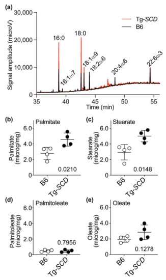 Cardiac lipids were analyzed after transesterification by gas chromatographic (GC) analysis with flame ionization detection (FID). For cardiac lipid analysis, we used the hearts of 8-month-old, male Tg-SCD mice and age-matched, male B6 control mice. Lipid analysis found that Tg-SCD hearts had increased levels of saturated fatty acids (Figure 10a and Figure A4). Notably, cardiac contents of saturated lipids, palmitate and stearate, were significantly increased in Tg-SCD hearts compared to non-transgenic B6 control hearts (Figure 10b,c). Cardiac palmitate levels of Tg-SCD mice were 1.63-fold higher than those of B6 controls, i.e., the cardiac palmitate content of Tg-SCD hearts was 4.6 μg/mg compared to 2.8 μg/mg in B6 controls (Figure 10b). Cardiac stearate content of Tg-SCD mice was 5.0 μg/mg, and cardiac stearate content of B6 controls was 2.9 μg/mg (Figure 10c).