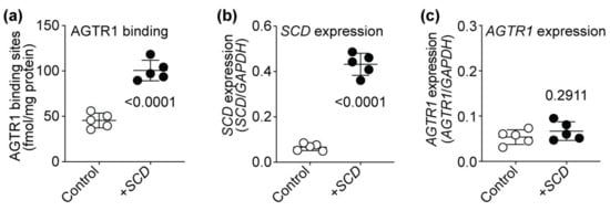 Does SCD alter AT1 receptor protein levels and the number of AT1 receptor binding sites in non-cardiomyocyte cells? We analyzed the impact of SCD on the number of AT1 receptor binding sites of AT1-receptor-expressing HEK (human embryonic kidney) cells to investigate whether SCD also affects the number of AT1 receptor binding sites of non-cardiomyocyte cells. HEK cells with stable AT1 receptor expression were transiently transfected with SCD expression plasmid or control vector, and the number of AT1 receptor binding sites was determined (Figure 12). Experiments found that increased SCD expression also significantly increased the number of AT1-receptor-specific binding sites of HEK cells (Figure 12a,b). Complementary to Tg-SCD hearts (cf. Figure A5), increased SCD expression did not affect the expression level of the AT1 receptor, AGTR1, in HEK cells (Figure 12c). Notably, expression levels of AGTR1, which was stably expressed in HEK cells under control of the ubiquitous CMV promoter, were not significantly different between HEK cells with and without SCD co-expression (Figure 12c). Together, these data show that SCD increases the number of AGTR1-specific binding sites in HEK cells and Tg-SCD hearts. In contrast, elevated SCD contents do not lead to increased expression levels of AGTR1 in HEK cells and Tg-SCD hearts.