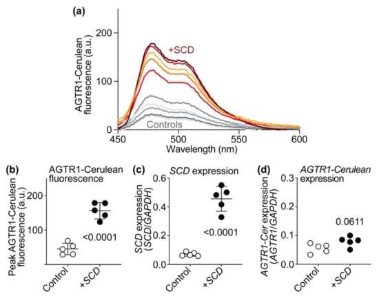 The AGTR1-Cerulean was quantified by fluorescence spectroscopy. HEK cells were transiently transfected with AGTR1-Cerulean, and AGTR1-Cerulean fluorescence was quantified without and with co-expression of SCD. Fluorescence spectroscopy showed that expression of SCD increased protein levels of AT1 receptor-Cerulean (AGTR1-Cerulean), which was determined by fluorescence spectroscopy (Figure 13a,b).