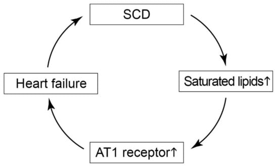 In concert with enhanced ROS generation, the angiotensin-II-generating ACE-AT1 receptor axis could directly enhance the accumulation of cardiotoxic lipids because angiotensin II AT1 receptor stimulation inhibits lipolysis and increases the activity of fatty acid synthase [,]. Thereby, the SCD-induced AT1 receptor could actively promote the accumulation of cardiotoxic lipids in Tg-SCD mice. Moreover, the AT1 receptor could impair the SCD-mediated increase in unsaturated lipids, most likely due to enhanced AT1-receptor-mediated ROS generation and lipid peroxidation [].