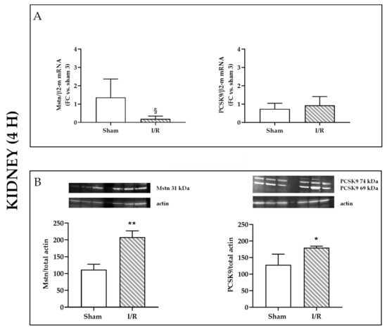 Kidneys of Sprague Dawley rats who had undergone 30 min of ischemia revealed, after 4 h of reflow, changes in Mstn and PCSK9: although mRNA levels were not significantly affected, with a tendency to Mstn lowering mRNA (Figure 1A), protein expression was augmented for both Mstn and PCSK9 (p < 0.01 and p < 0.05, respectively), as detected by western blot analysis (Figure 1B).