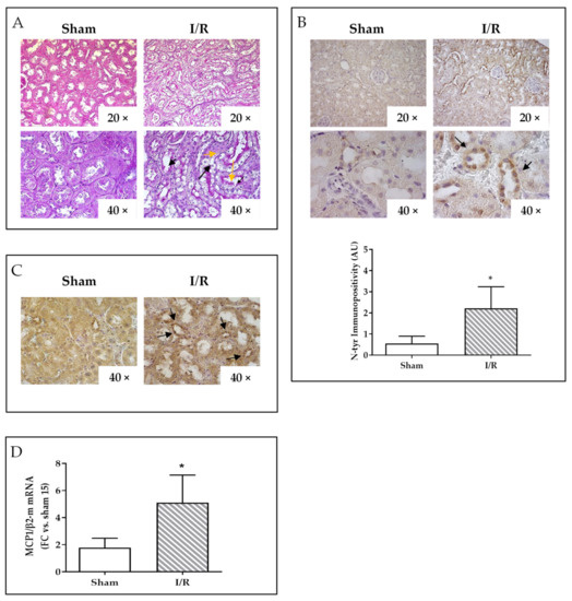 Analysis of rat kidneys after sham intervention or ischemia/reperfusion (I/R, 30 min/24 h). (A) PAS staining showing areas of tubular necrosis in I/R kidney (right panels): yellow arrows indicate swollen cells and black arrows indicate the site of cell loss within the tubuli. (B) N-tyr immunostaining, representative images (top) and image analysis quantification (bottom); * p < 0.05. (C) PGC-1α immunostaining: black arrows display the nuclear positivity in representative images. (D) MCP-1 mRNA expression after 24 h of reperfusion by quantitative real-time PCR. The results have been normalized by expressing the number of transcript copies as a ratio to β2-microglobulin (β2-m) and indicated as fold changes (FC) in respect to kidneys from sham-operated rat (#15); * p < 0.05.