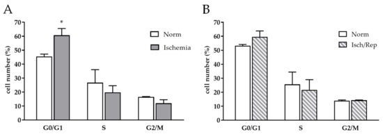 Looking at the cell cycle progression, 20 h of ischemia promoted an increase in the G0/G1 phase (p < 0.05), while no significant difference was recorded in the S and G2/M phase when compared to cells kept in standard cell culture conditions (“Normoxia”) (p < 0.05) (Figure 4A). A further 24 h of normoxia and complete culture medium restored the proliferative rate at the same extent as normoxic control cells (Figure 4B).