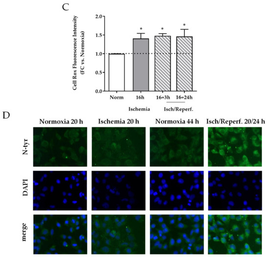 ROS production was measured with the CellROX™ probe after 16 h of ischemia and 3 and 24 h after having restored reperfusion-like conditions. A 50% increase of intracellular ROS was recorded at each time point (p < 0.05) (Figure 4C). Accordingly, an immunofluorescence signal for N-tyr, a stable marker for oxidative damage, was slightly increased after ischemia and highly enhanced 24 h after reperfusion (Figure 4D).