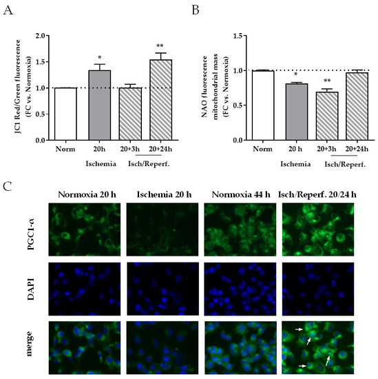 We then focused on mitochondrial balance, an early playmaker in cell response during I/R. Mitochondrial membrane potential, expressed as the ratio of the red/green fluorescence intensity of the JC-1 dye, was increased right after 20 h of ischemia and 24 h after reperfusion (35% and 48% increase versus normoxic control cells, p < 0.05 and p < 0.01, respectively) (Figure 5A). The nonyl acridine orange (NAO) signal, which indicates mitochondrial mass, was decreased by 20 h ischemia and even more deeply after 3 h of reperfusion (20% and 30%, p < 0.05 and p < 0.01, respectively); it recovered after 24 h of reperfusion (Figure 5B).