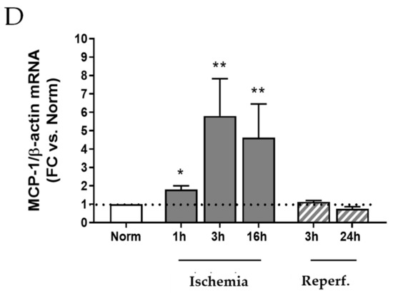 Consistently, the immunofluorescence signal for PGC-1α, a transcriptional coactivator involved in mitochondrial biogenesis, was decreased 20 h after ischemia and sensibly increased after 24 h of reflow-like conditions (Figure 5C). During ischemia, MCP-1 mRNA was significantly increased (p < 0.05 and p < 0.01) (up to five fold after 3 h) (Figure 5D).