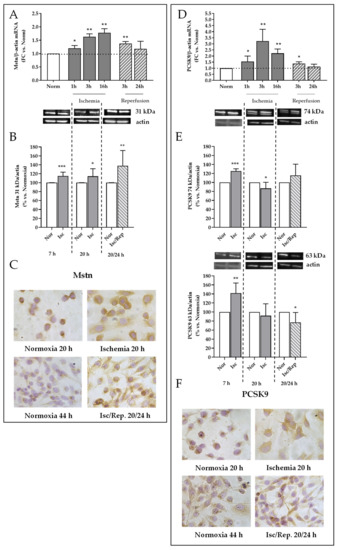 Mstn and PCSK9 during I/R in HK-2 tubular renal cells. Mstn: (A) mRNA levels after ischemia (1, 3, and 16 h) and reperfusion (3 and 24 h) by quantitative real-time PCR. The results have been normalized by expressing the number of transcript copies as a ratio to β-actin and indicated as fold changes (FC) in comparison to control cells (Normoxia); * p < 0.05, ** p < 0.01. (B) Western blot analysis of Mstn 31 kDa. Bands of interest were normalized against those obtained by membrane rehybridization with anti-total actin antibody. Representative immunoblots are shown. Data obtained from at least 3 independent experiments are expressed as % ± SEM in respect to control cells (Normoxia); * p < 0.05, ** p < 0.01, *** p < 0.001. (C) Immunocytochemistry for Mstn using DAB as chromogen; magnification 40×. PCSK9: (D) mRNA levels after ischemia (1, 3, and 16 h) and reperfusion (3 and 24 h) by quantitative real-time PCR. The results have been normalized by expressing the number of transcript copies as a ratio to β-actin and indicated as fold changes (FC) in respect to control cells (Normoxia); * p < 0.05, ** p < 0.01. (E) Western blot analysis of PCSK9 74 and 63 kDa isoforms. Bands of interest were normalized against those obtained by membrane rehybridization with anti-total actin antibody. Representative immunoblots are shown. Data obtained from at least 3 independent experiments are expressed as % ± SEM in respect to control cells (Normoxia); * p < 0.05, ** p < 0.01, *** p < 0.001. (F) Immunocytochemistry for PCSK9 using DAB as chromogen; magnification 40×.