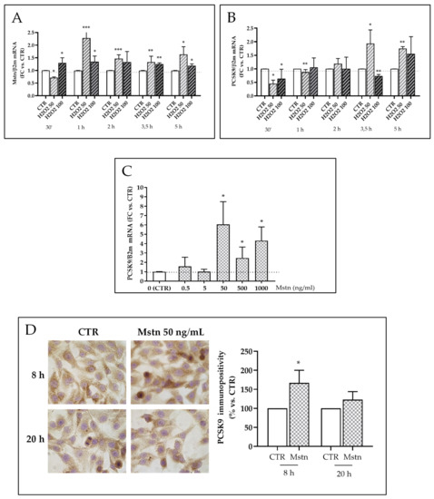- H2O2-dependent effects on Mstn and PCSK9 expression were evaluated by treating cells with two different concentrations of H2O2 (50 and 100 μM) (Carlo Erba, Milan, Italy) for different times (30 min, 1, 2, 3,5, and 5 h) in standard culture conditions;