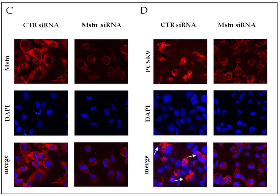 - Mstn silencing was obtained by the transfection of HK-2 cells with 30 nM Mstn specific siRNA (Mstn siRNA) or negative control siRNA (CTR siRNA), also named “Φ”, using lipofectamine (Thermo Fisher Scientific, Waltham, MA, USA), according to the manufacturer’s protocol. Cells were then incubated at 37 °C in a CO2 incubator for 24 h until they were ready for assay. The efficacy of knockdown was determined by real-time PCR and immunofluorescence.