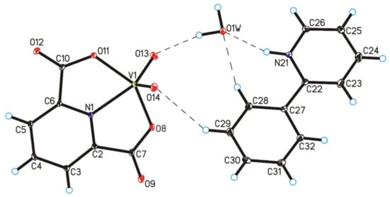 Recently, there has been increasing interest in complex compounds containing d-block metal ions with organic ligands exhibiting antioxidant properties. The literature describes the antioxidant properties of copper(II) complex compounds with heterocyclic and polycarboxylate ligands: e.g., [Cu(ida)(phen)(H2O)] ∙ 2 H2O; [Cu(dipic)(4-pic)]n, [Cu(oda)(4-pic)H2O] ∙ 2 H2O, [Cu(oda)(bipy)(H2O)] ∙ 4 H2O (ida denotes iminodiacetate, oda = oxydiacetate, 4-pic = 4-picolinate, phen = 1,10-phenanthroline, bipy = 2,2′-bipyridyl). Studies have shown that copper(II) coordination compounds are antioxidants, but unfortunately in a concentration that is about 450–1550 times greater than superoxide dismutase []. Therefore, our interests focused on the antioxidant properties of oxovanadium(IV) and dioxovanadium(V) complex compounds. The methods of synthesis, characterization and biological properties of dioxovanadium(V) OH-substituted dipicolinate complexes have been previously described in the literature []. These complexes exhibit insulin-like activity. The Crans group conducted research on Cl-substituted dipicolinate complexes of vanadium(III, IV, V) and they confirmed that these compounds cause anti-diabetic effect on rats []. Studies have confirmed that the oxygenation state of vanadium has an impact on the insulin-like properties of complexes []. The antioxidant properties of the vanadium complexes can be directed towards the two-electron transfer reactions then their toxicity is lowered [,].