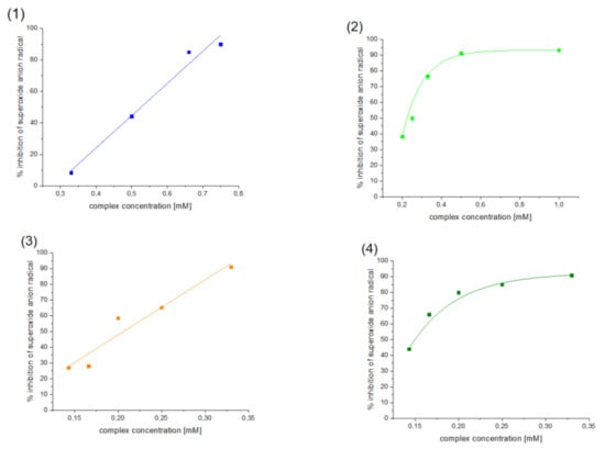 Inhibition of superoxide anion radical by (1) [VO(dipic)(H2O)2]·2 H2O, (2) [VO(dipic)(phen)]·3 H2O, (3) [VO(dipic)(bipy)]·H2O and (4) [VOO(dipic)](2-phepyH)·H2O.