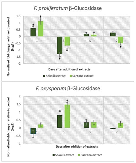 β−Glucosidase gene expression of F. proliferatum (PEA1) and F. oxysporum (1757 OX) from day 1 to day 7 after the addition of the Sokolik and Santana extracts. Error bars represent the standard error. * Statistically significant (p < 0.05).