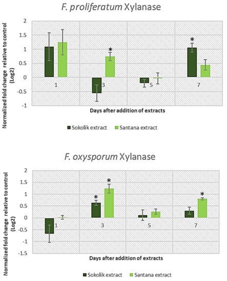 Xylanase gene expression of F. proliferatum (PEA1) and F. oxysporum (1757 OX) from day 1 to day 7 after the addition of the Sokolik and Santana extracts. Error bars represent the standard error. * Statistically significant (p < 0.05).