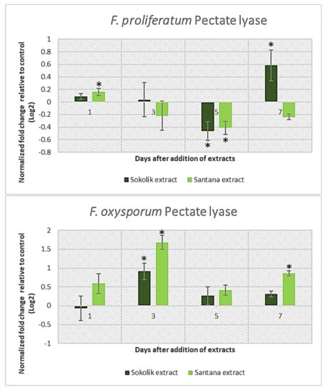 Pectate lyase gene expression of F. proliferatum (PEA1) and F. oxysporum (1757 OX) from day 1 to day 7 after the addition of the Sokolik and Santana extracts. Error bars represent the standard error. * Statistically significant (p < 0.05).