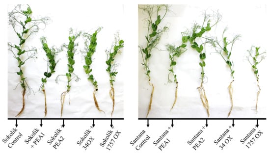 A very low degree of disease symptoms was observed in the infected plants. However, all the infected plants from both cultivars showed reduced growth and a decreased number of lateral roots and leaves (Figure 4). Santana was found to have a higher growth retardation upon infection with PEA1, 34OX and 1757OX, whereas all the infected Sokolik plants had similar growth reductions. The infected and control plants cannot fully show or explain why the infected plants have reduced growths but give indirect proof of the pathogen influence on the plants, along with demonstrating how the susceptible and resistant cultivars react to the infection with the same strains.
