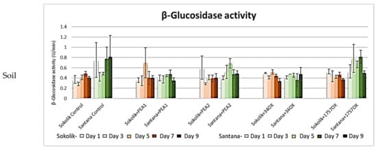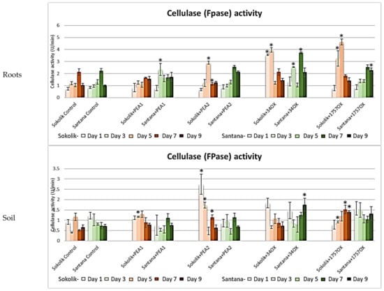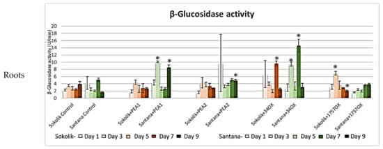 β-glucosidase assays showed that Santana infected with PEA1 and 34OX expressed the highest enzyme activity compared to the other two strains, especially on day 9 and day 7, respectively (Figure 5). The maximum activity of 14.8 U/min was detected in Santana upon infection with 34OX on day 7. The highest β-glucosidase activity in Sokolik was observed in 34OX-infected plants on day 7, similar to that of Santana. No significant elevation in the enzyme activity was observed in the soil samples. The plant cellulose degradation involves enzymes such as endo-β-1,4-glucanases, exo-β-1,4-glucanases and β-Glucosidases []. The endo-β-1,4-glucanases activity in the Sokolik roots infected with PEA1, PEA2 and 1757OX was found to be significantly higher than the controls, specifically on days 1 and 7. No statistically significant differences were observed for Santana plants, along with the results from the soil (p > 0.05). Likewise, no significant elevation in the activity was observed for exo-β-1,4-glucanases in both pea roots and rhizospheres, indicating that β-glucosidase is the major cell wall-degrading enzyme produced by Fusarium species used in this study. The graphical representations of the protease, polygalacturonase, chitinase, endo β-1,4 glucanase and exo-β-1,4-glucanase enzyme activity results are presented as Supplementary Materials (Tables S1–S5 and Figures S1–S5).