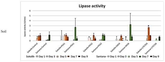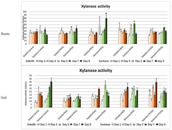 All the infected Santana plants showed a higher activity of xylanase during the last days of growth (Figure 6). Although a slight increase in the activity was observed in Sokolik, especially on day 3, the values dropped on the subsequent days. There was a gradual increase in the xylanase activity in Santana in the control during the observed days. However, the soil samples with strains PEA2, 34OX and 1757OX infected in Sokolik showed a higher activity of xylanase on day 9.