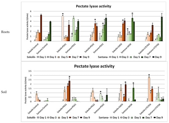 Pectate lyase activity (micromoles of galacturonic acid produced per minute (U/min)) obtained from the roots and soil of Sokolik and Santana infected with PEA1, PEA2, 34OX and 1757OX and the control (calculated from triplicate treatments). Error bar represents the standard error. * Statistically significant (p < 0.05).