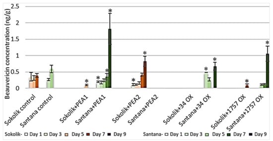 Concentration of beauvericin (ng/g) in Sokolik and Santana roots upon infection with PEA1, PEA2, 34OX and 1757OX calculated from triplicate treatments. Error bar represents the standard error. * Statistically significant (p < 0.05).