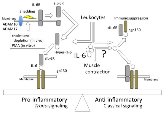 IL-6 shows a pro- or anti-inflammatory effect that is determined by its signaling manner. The pro-inflammatory function of IL-6 is due to trans-signaling. This occurs when IL-6R (sIL-6R) is cleaved by sheddases, such as ADAM10 and ADAM17, which are activated by the depletion of cholesterol and/or phorbol 12-myristate 13-acetate (PMA) into its secretory form and binds to IL-6, which is followed by signaling to gp130-expressing cells. The anti-inflammatory effect is induced in the classical signaling manner. Although sgp130 has a low affinity for IL-6 alone, it has a high affinity for the IL-6/sIL-6 complex (hyper-IL-6); therefore, it suppresses the pro-inflammatory effect.