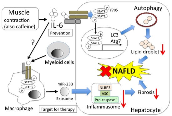 Predicted NAFLD alleviation model of muscle-derived IL-6. Muscle contraction promotes IL-6 production from muscle cells. The produced IL-6 is then secreted into the blood and it induces the phosphorylation of STAT3 in hepatocytes. Phosphorylated STAT3 translocates into the nucleus. Autophagosomes are formed due to the activity of autophagy-related genes, such as LC3 and Atg7, whose expression is regulated by phosphorylated STAT3 (Y705). Autophagy results in the breakdown of lipids in hepatocytes, leading to NAFLD alleviation. There is also a pathway in which IL-6 that is derived from myeloid cells reduces fibrosis in hepatocytes. This is the pathway by which IL-6 acts on macrophages to secrete exosomes, including miR-233. The miR-233 reduces the inflammasome activity of hepatocytes. Whether muscle-derived IL-6 has a similar effect is unclear. Thus, the muscle-derived IL-6 signaling pathway is important in the prevention of NAFLD, and leukocyte-derived IL-6 is important from a therapeutic point of view.