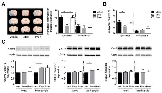 One of the main pathophysiological features of IS is disruption of the BBB, which significantly contributes to the development of brain injury and subsequent neurological impairment []. Consequently, the extent of BBB damage and the formation of brain edema was assessed after focal cerebral ischemia. Twenty-three h after reperfusion, the integrity of the BBB, as reflected by the concentration of the vascular tracer Evans Blue leaking into the brain parenchyma, was significantly reduced in the ipsilateral but not contralateral hemispheres of edoxaban-treated mice in comparison to vehicle- or phenprocoumon-treated animals (Figure 2A). This observation also correlated with a marked reduction in cerebral water content in the ipsilateral hemispheres of animals treated with edoxaban compared to the other groups (Figure 2B). In accordance with the stabilizing effect of edoxaban at the BBB, augmented levels of the tight junction proteins claudin-3 and claudin-5 were observed by Western blotting in the ischemic basal ganglia of edoxaban-treated mice at day 1 after tMCAO compared with vehicle treatment (Figure 2C). Cortical protein levels as well as levels of occludin were not altered.