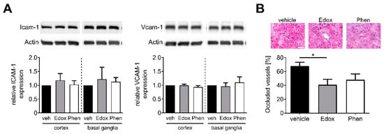 Edoxaban reduces intracerebral thrombosis. (A) Top: Intercellular adhesion molecule-1 (ICAM-1) and vascular cell adhesion molecule-1 (VCAM-1) protein expression in the ischemic cortices and basal ganglia of vehicle (veh)-, edoxaban (Edox)-, or phenprocoumon (Phen)-treated mice at day 1 after tMCAO as determined by immunoblot. Actin was used as loading control. Bottom: Densitometric quantification of ICAM-1 and VCAM-1 immunoreactivity in the ipsilateral cortex and basal ganglia of vehicle-, edoxaban-, or phenprocoumon-treated mice (n = 4). (B) Top: Representative H&E stains in the ischemic hemisphere of vehicle-, edoxaban-, or phenprocoumon-treated mice 24 h after tMCAO (Scale bar = 50 µm). Thrombotic vessels were shown in vehicle- and phenprocoumon-treatment groups, whereas an open vessel is shown for the edoxaban group. Bottom: Percentage of occluded vessels in the ischemic hemispheres of vehicle-, edoxaban-, or phenprocoumon-treated mice at day 1 after tMCAO (n = 5). * p < 0.05.