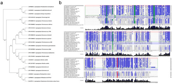 Comparison of L-asparaginase (L-ASNase) from T. sibiricus (TsA) with selected L-ASNases of thermophilic and mesophilic origin. (a) Molecular phylogenetic analysis of selected L-ASNases by maximum likelihood method. The analysis involved 22 amino acid sequences. There were a total of 371 positions in the final dataset. Evolutionary analyses were conducted in MEGA X [60]. (b) Amino acid sequence comparison of L-ASNase T. sibiricus (WP_015849943, marked with red box) with its homologs from thermophiles P. horikoshii (WP_010884185), T. litoralis (WP_004066133), Pyrococcus sp. ST04 (WP_014733272), T. kodakarensis (WP_011250607), T. zilligii (WP_010478656), Thermococcus sp. AM4 (WP_014121981), T. gammatolerans (WP_015859055), P. furiosus (WP_011013191), P. yayanosii (WP_013906452), T. lienii (WP_014163150) and Streptomyces thermoluteus subsp. fuscus (BAJ25701.1) and mesophiles P. atrosepticum (AAP92666.3), E. coli (type II—AAA23445.1, type I—WP_044859994.1, WP_167585435.1), D. chrysanthemi (AAS67028.1), Bacillus subtilis (AAA22243.1, type I—WP_217018301.1, WP_213417497.1), R. rubrum (QXG80441.1) and Rhizobium etli CFN 42 (AAF00929.1). Identical amino acid residues are marked by blue, strongly conserved residues crucial for the catalytic activity of selected L-ASNases are indicated by green, observed key substitutions are marked by red. Amino acid sequences of hyperthermophiles are marked in green boxes; FDA-approved L-ASNases (in processed form) are marked in blue boxes. Multiple sequence alignments were carried out using Clustal version 2.1 [61].