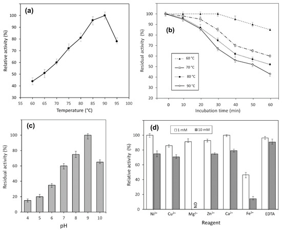 The enzymatic activity of the purified enzyme was monitored in different pH systems, ranging from pH 4.0 to 10.0, as described in Section 4. The pH-dependent activity profile is given in Figure 3c.