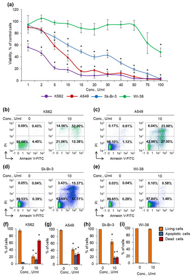 Cytotoxic activity of the enzyme against cancer cells. Cancer cells and normal fibroblasts were cultivated for 72 h in the presence of different concentrations of the enzyme. (a) Cell viability measured by MTT test. (b–e) Representative flow cytometry diagrams for cells incubated with 10 U/mL of the enzyme and labeled with annexin V-FITC and PI. Ratios of living cells (lower left quadrants), apoptotic cells (lower right quadrants) and dead cells (two upper quadrants) are presented. (f–i) Histograms of live, apoptotic and dead cells incubated with 10 U/mL of the enzyme. Conc., concentration. PI, propidium iodide. n = 4. * p ≤ 0.05 vs. control untreated cells.