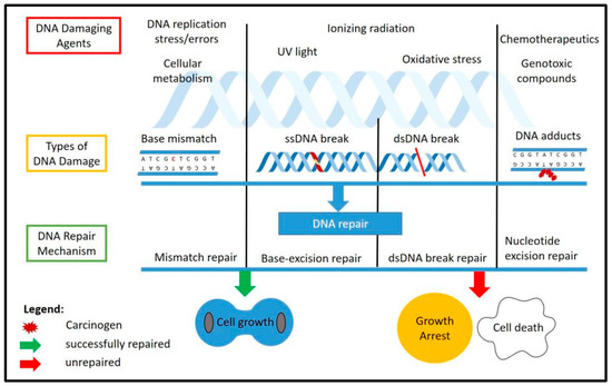 DNA damage could occur in cells either endogenously, through normal cellular replication [17,18] and metabolism [19,20], or exogenously through ultraviolet (UV) [21,22], ionizing radiation (IR) [23,24] or various genotoxic compounds [25,26] that could induce DNA damage. Different stressors will cause different types of DNA damage. Normal DNA replication could induce mismatch of the nucleotide and cause mutations [27,28,29,30]. Stressors such as oxidative stress will produce reactive oxygen species (ROS) from normal cellular metabolism or from external genotoxic compound [31,32,33], which will cause DNA breaks, either single-stranded or double-stranded [34,35,36]. Unrepaired DNA damage could cause severe mutations and chromosomal instability, which would have detrimental effects on the cells and lead to cell death, while DNA breaks that are repaired through non-homologous end joining (NHEJ) might cause mutations during the process.