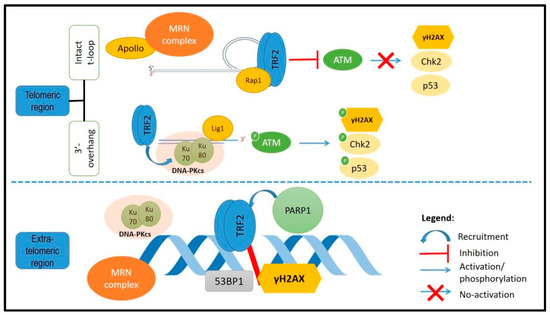 There are two ways by which TRF2 inhibits the ATM kinase. The first one is by actively inhibiting the autophosphorylation of ATM at S1981, as this phosphorylation will activate ATM to activate its downstream factors, such as γH2AX and p53, thus initiating the DNA damage repair cascade [113]. TRF2 also inhibits ATM activation through the formation of t-loop [117]. When t-loop is formed at the telomeres, the telomere end will not be able to be recognized as a DNA strand break by ATM and other DDR factors [117].